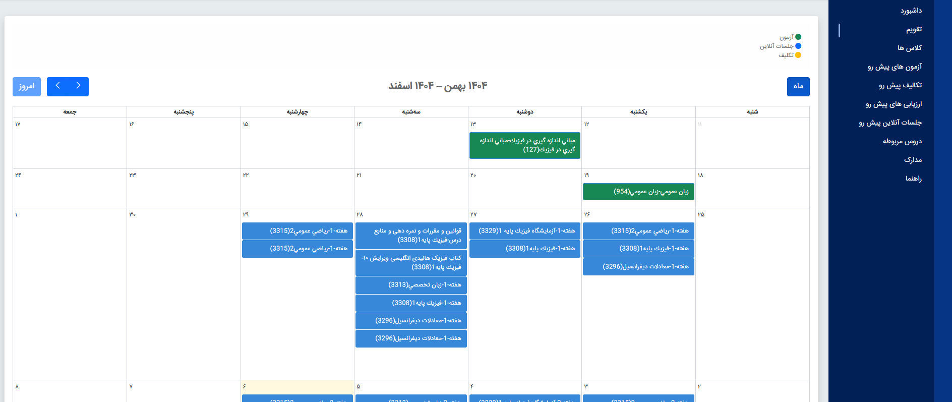 اکنون در پنل دانشجو و استاد، یک تقویم مرکزی قرار داده شده که تمامی رویدادهای مرتبط با دورهها را بهصورت تجمیعشده نمایش میدهد: